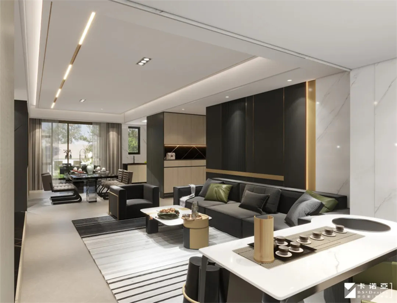去客廳化設計,客廳與陽臺之間茶臺隔斷,構(gòu)筑一個最美的品茶區(qū) ,客廳可同時滿足會客、辦公就餐,以及兼顧茶室功能,不再將客廳功能固化,而是讓業(yè)主按照自己的使用習慣和生活方式進行隨意使用。