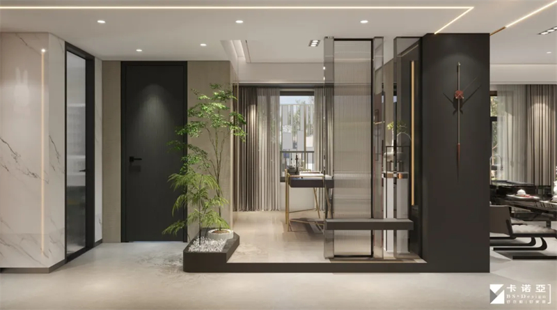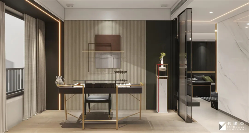 開放式書法室,以淡雅、寧靜色調(diào)為主,深色點綴,營造靜謐、專注的氛圍。材質(zhì)上,選用格柵板、金屬、玻璃、大理石等跨界混搭,綠植點綴,既符合書法的自然氣息,又能提升室內(nèi)的輕奢質(zhì)感。