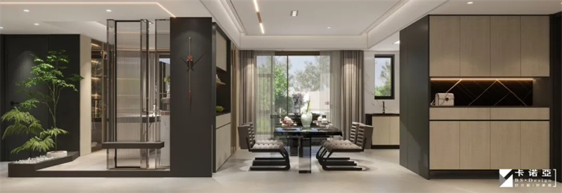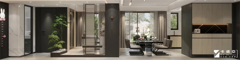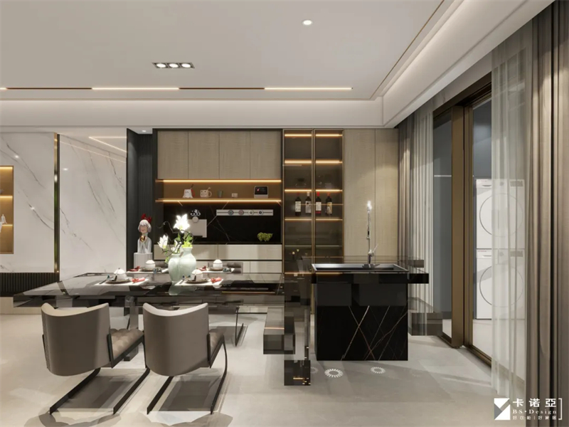 靠近餐桌的地方設置了餐酒柜,色彩與全屋呼應,茶色玻璃柜門通透可見,可以收藏香檳與紅酒、杯具,觥籌交錯,微醺生活,是E人聚會轟趴的好地方。