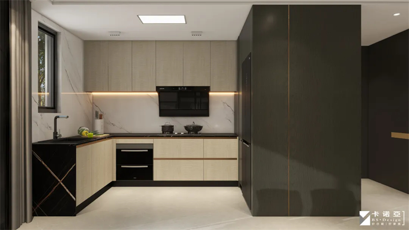 ③廚房采用高級黑+白撞色設計,溫馨木色減緩空間冷感