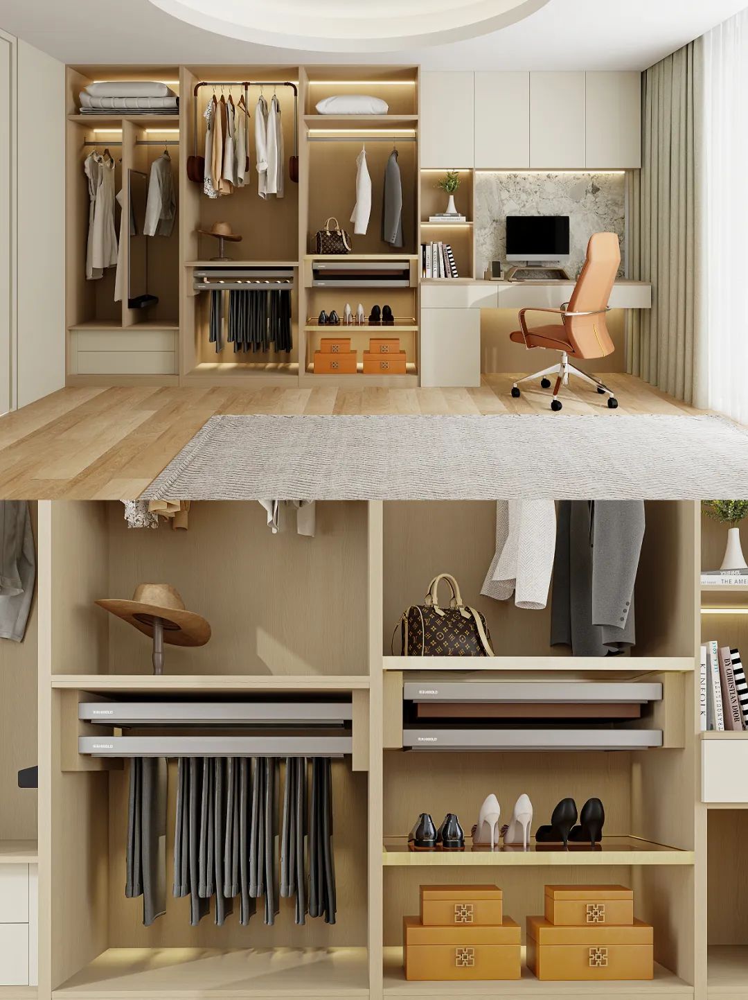 ??書桌柜與衣柜一體化設計,視覺效果更整體流暢,節省空間的同時也加大了儲物空間。