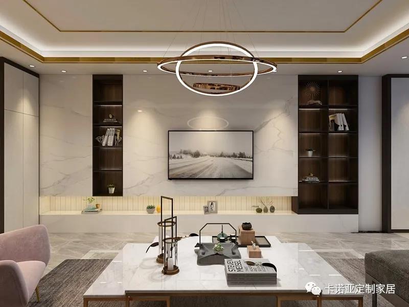玄關(guān)左邊即是客廳電視背景墻,漢白玉點(diǎn)綴黑澤明,