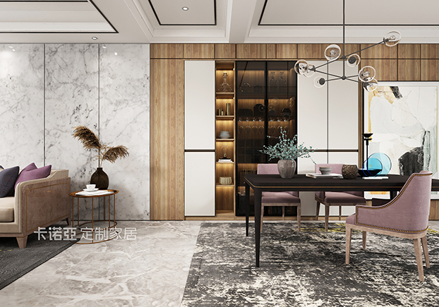 餐廳比較小清新風(fēng),淡紫色的餐凳,木色和白色相間的墻面,顏色清新的裝飾畫(huà),都讓人很舒適輕松。
