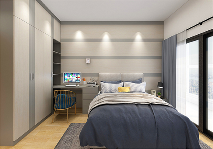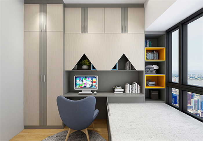 臥室有一個超大肚量的衣柜,高度直接到頂,寬度占據(jù)一整面墻,衣柜+書桌書柜一體設計,收納衣物、寫字看書學習都有了。