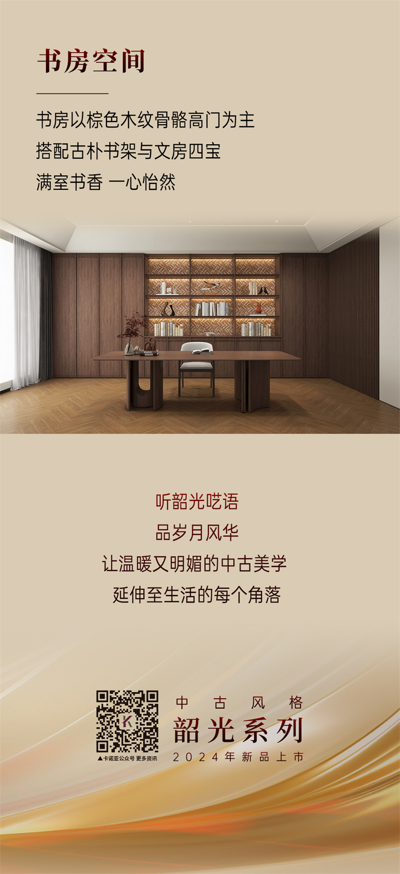 2024年新品系列,韶光 |中古風棕色胡桃木紋為主色調,搭配白色暗紋,細膩的藤編門與硬朗的骨骼門讓人聯想到古老的家具,充滿了歲月的痕跡。木紋的邊框+細密的藤編,自帶復古朦朧美感;拼樞門和藤門結合運用,使整個空間透氣感強,并擁有獨特舒適的慵懶氛圍。