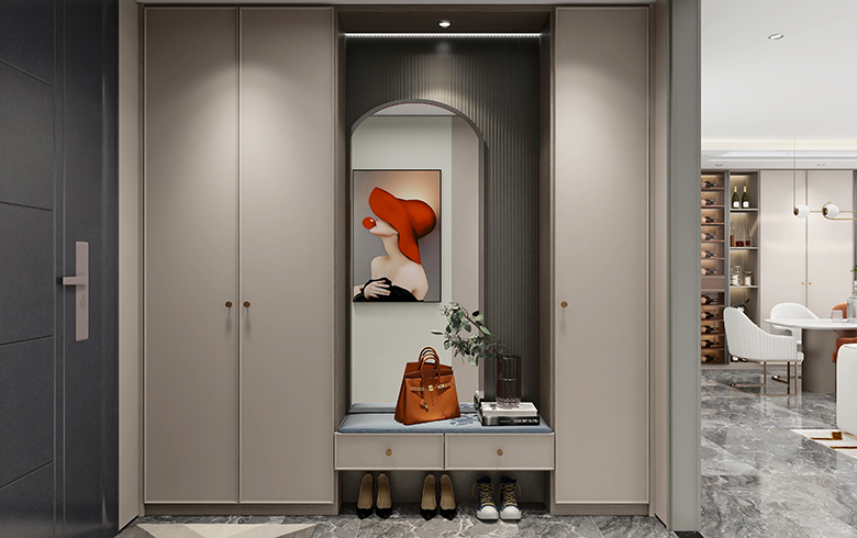 玄關(guān)柜采用“慕尼黑”與“優(yōu)雅暖灰”的撞色搭配,賦予門(mén)廳更多的色彩層次。中間凹位設(shè)計(jì),上凹位留出展示窗,放置包包、鑰匙、帽子、綠植、飾品等,放上試衣鏡,整理儀容亦可放大空間;下凹位放常用鞋子。“慕尼黑”格柵背景板,成為門(mén)廳吸睛點(diǎn)。
