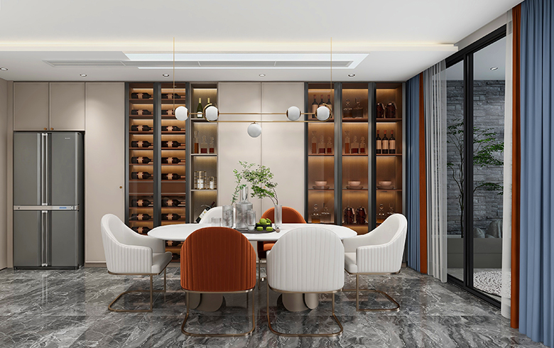 餐邊柜靠墻定制,空間有效利用,隱梁隱柱,雙門(mén)冰箱嵌入式,整體視覺(jué)更統(tǒng)一。餐邊柜延續(xù)客廳配色,“優(yōu)雅暖灰”柜門(mén)+“流光漫步”柜體,加入玻璃門(mén)、燈帶,唯美展示名酒,彰顯不凡品味。