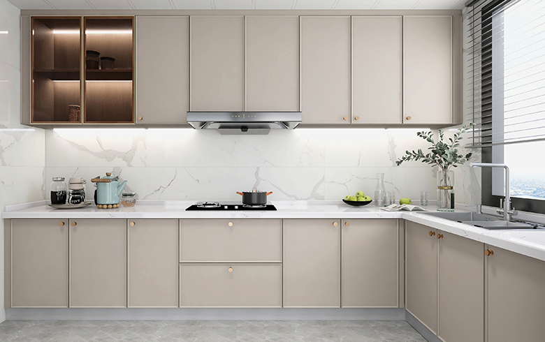 長(zhǎng)條形廚房定制L型廚柜,轉(zhuǎn)角不浪費(fèi),大量的地柜、吊柜,炊具刀具調(diào)料通通隱藏,讓臺(tái)面保持整潔。吊柜中加入玻璃材質(zhì)+燈帶,一改整堵墻封閉式柜子的壓迫感,下廚多了一份輕盈。應(yīng)用高級(jí)“優(yōu)雅暖灰”,瞬間營(yíng)造高端廚房印象。