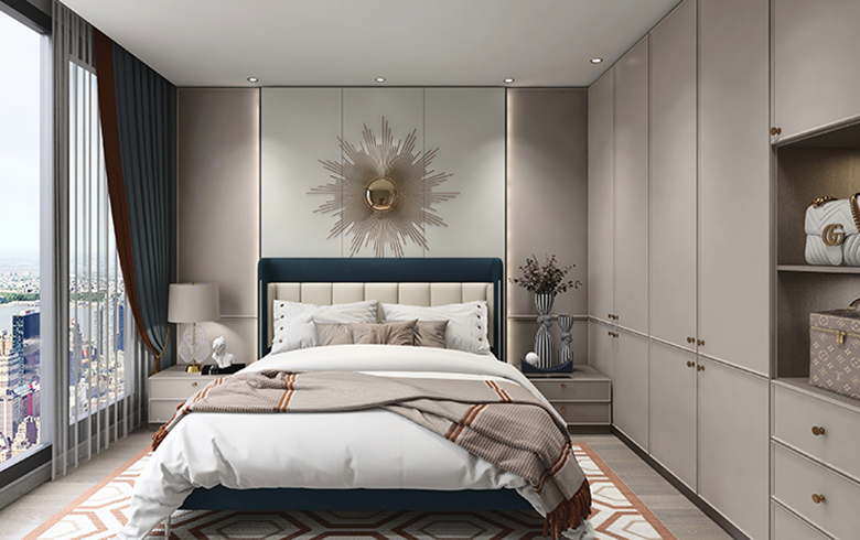 臥房大量應(yīng)用淺色調(diào)“流光漫步、優(yōu)雅暖灰”,安定情緒,助力睡眠。床頭背景墻使用護(hù)墻板,隔音降噪,柔軟的絲絨床頭可以靠著看書(shū),適合睡前閱讀。床頭柜加入跳躍的“電光墨綠”,讓臥室洋溢大自然氣息。床側(cè)定制靠墻衣柜,一側(cè)做成半開(kāi)放式,更適合放置睡前常用物品。
