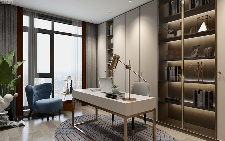 靠墻定制書(shū)柜,柜門(mén)、柜體采用“優(yōu)雅暖灰、流光漫步”的搭配,讓書(shū)房氣質(zhì)超然。開(kāi)放加封閉結(jié)合,讓空間有了呼吸感,工作身心更愉悅。玻璃柜門(mén)方便打理也同時(shí)擁有展示功能,落地窗邊放置一張沙發(fā)和邊幾,營(yíng)造慵懶氛圍,累了可以在此品茗休憩。