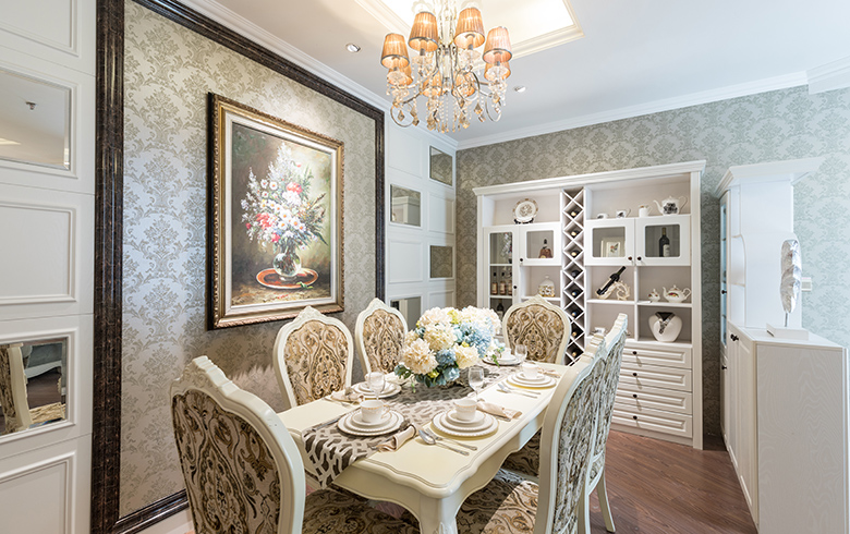 餐廳充盈著白色的純粹,如初戀般純凈與美好,橡木錯落有致的紋理,帶來別樣精致的質(zhì)感。家具中流暢線條的寫意設計,看似隨意刻畫的簡歐風情卻表達得恰到好處。