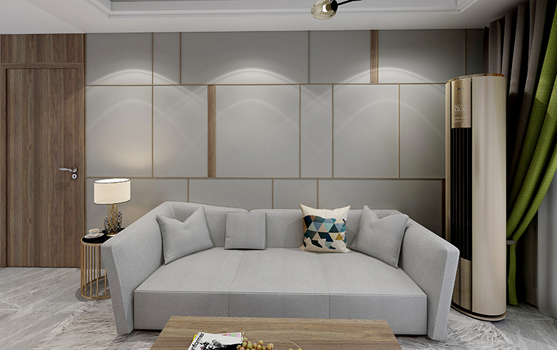 免漆門使用時尚豎紋,與整體灰色護墻板點綴的長條形木紋相呼應(yīng),整體視覺流暢空曠,原木色、灰色的混搭讓客廳更具層次感。