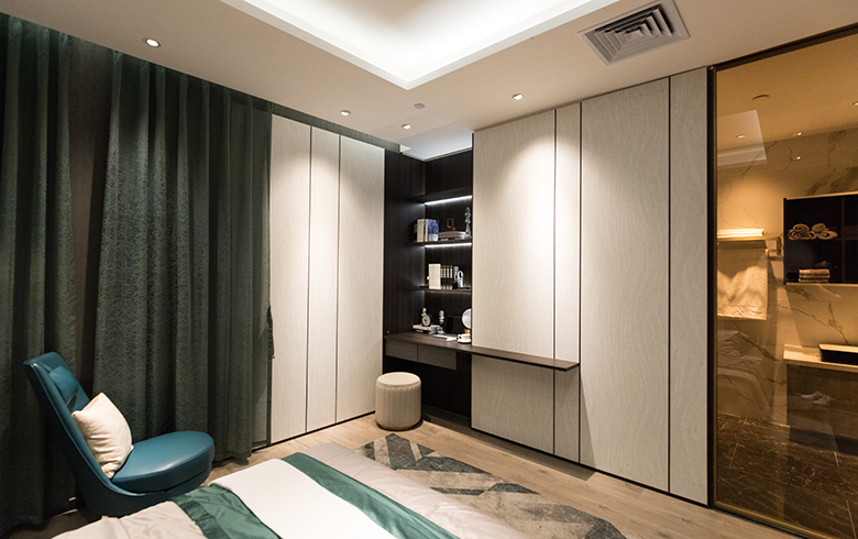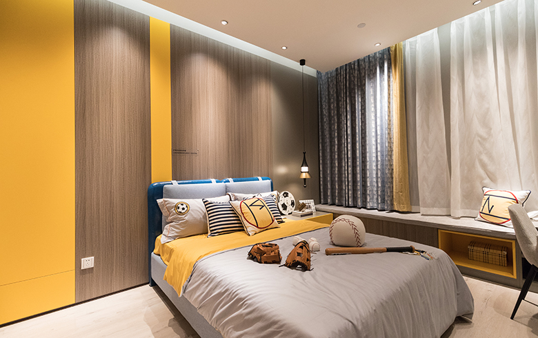 不同于普通的兒童房墻面采用油漆,本套空間的墻面加入了護墻板,除了營造簡潔明快的專屬兒童臥房特征之外,采用原木色與活力橙條紋相間的護墻板,清新健康,為整個空間增添了活力,床上橙色的蓋毯與近乎同色的金黃色窗簾,營造出一種和諧環保自然的氛圍,同時也對墻面起到保護作用,避免小淘氣對墻面造成“破壞”,起到一箭雙雕的作用。