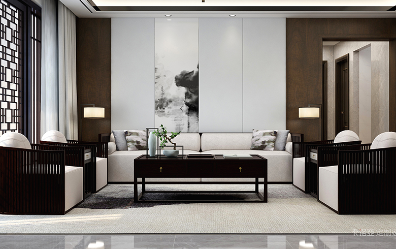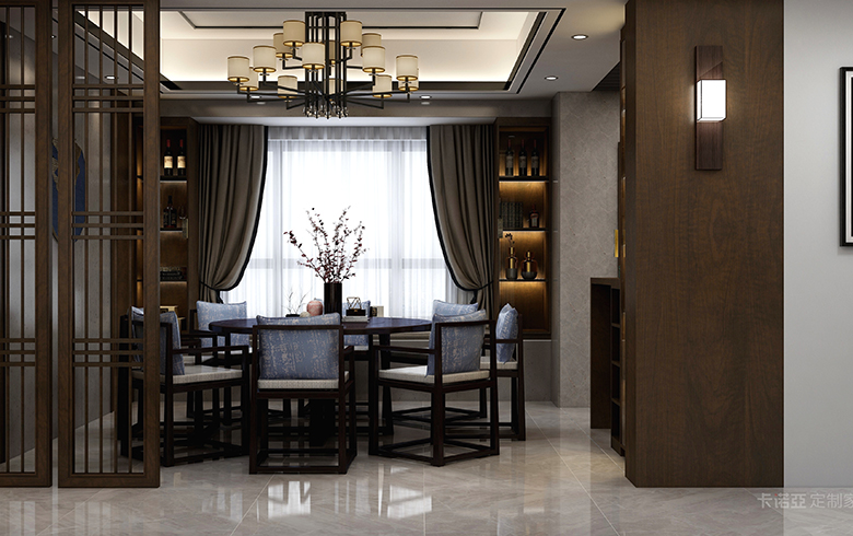 客餐廳整墻采用煙雨江南系列護墻板,整體空間呈灰、白色調,白墻粉黛的水墨江南被巧妙的搬入到居室之中;而軟裝的黃、藍色調點睛之作則來自江南的春天色彩,記憶中的江南藍花布,將江南水鄉自然、人文之美也帶進居室生活中。為了空間以及風格的統一性,將原有的歐式吊頂和西廚櫥柜拆除,重新設計為備餐區域,柜子采用黑檀香撞印象白,護墻板配以柔和穩重、不事張揚的“太空石”灰,仿佛可以看見居者身上所散發出的柔和低調、優雅的江南氣質!煙雨、詩詞,這是記憶中的江南;白墻、黛瓦、青石板路,這是印象中的江南;江南不僅是一個地域,也是是一種觀念,一種現代人趨之若鶩的生活方式,更是當代中國人的居室夢想!