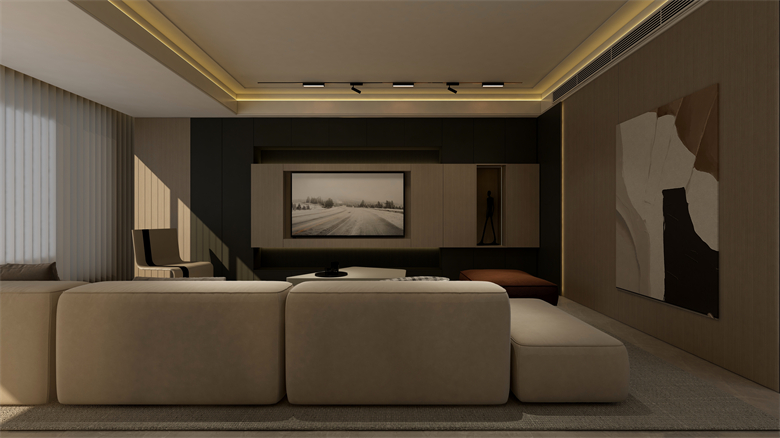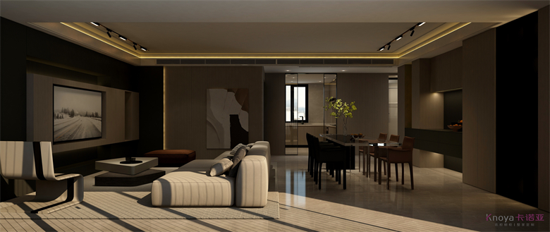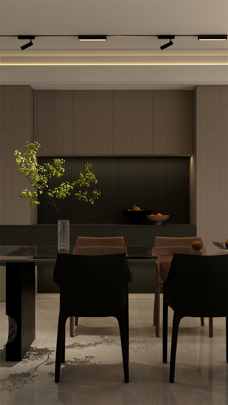 本案設(shè)計(jì)圍繞業(yè)主意式極簡(jiǎn)風(fēng)格的需求,主色調(diào)黑、白、灰、咖,多利用金屬色、木色、石材做出變化,點(diǎn)綴少量艷麗色。柜墻門一體化,采用穿插、進(jìn)退等設(shè)計(jì)手法,配合燈光使空間簡(jiǎn)潔又頗具設(shè)計(jì)美感。意式極簡(jiǎn)風(fēng)格刪繁就簡(jiǎn),遠(yuǎn)離一切浮華和不實(shí)用,從生活本質(zhì)出發(fā),以極簡(jiǎn)的設(shè)計(jì)演繹出最本質(zhì)的輕奢美學(xué)。