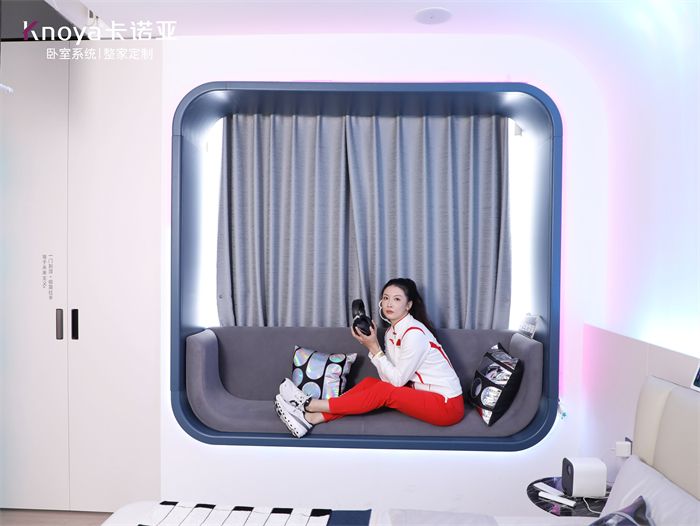 進(jìn)入“樂(lè)在臥室”系列產(chǎn)品時(shí),陳曉君禁不住坐在了卡諾亞專為活力青年設(shè)計(jì)的太空艙飄窗上,打開(kāi)繽紛極光燈時(shí),整個(gè)空間充滿了未來(lái)的科幻感,仿佛置身極地的星空下,美輪美奐,讓人充滿遐想。針對(duì)年輕人喜愛(ài)的潮流手辦,專門(mén)打造的展示柜,讓心愛(ài)的“它”有了歸屬。看到可升降電競(jìng)桌,我們的體育明星也童心未泯,忍不住坐到電競(jìng)椅上,敲打鍵盤(pán),點(diǎn)擊鼠標(biāo),準(zhǔn)備開(kāi)黑呢!更讓陳曉君驚奇的是,這里還有一個(gè)隱藏式投影屏幕,躺在床上就可以看電影、看動(dòng)漫,搭配床頭投影出水波紋的藍(lán)光,在場(chǎng)的人都沉浸在對(duì)浩瀚星際的幻想中。