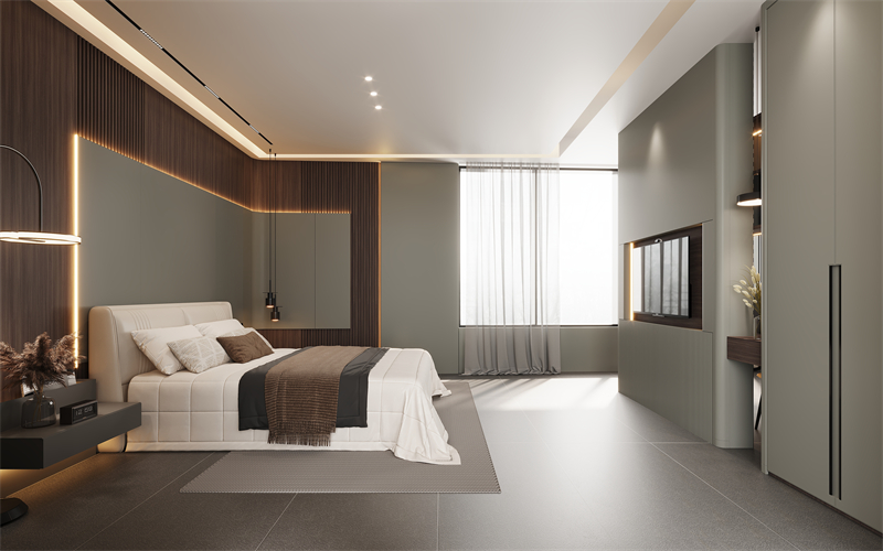 【睡眠區(qū)】床頭護(hù)墻板,一前一后采用溫暖的深木色搭配溫婉的“薄暮灰”,護(hù)墻板轉(zhuǎn)角采用圓弧過渡,優(yōu)雅流暢的曲線輪廓,彰顯空間的圓潤(rùn)感、高級(jí)感和立體感。柔軟舒適的寢具,讓每個(gè)追夢(mèng)人沉浸美夢(mèng)之中。