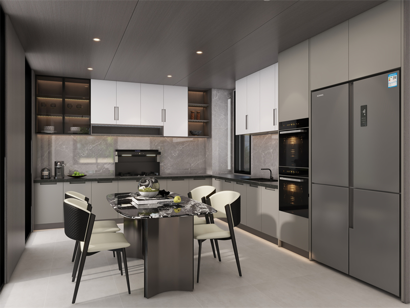 餐廚一體化設(shè)計(jì),破除空間壁壘,打造通透自由家。L型廚房布局,科學(xué)分區(qū),下廚井然有序。柜電一體化設(shè)計(jì)視覺統(tǒng)一協(xié)調(diào),還能充分釋放儲(chǔ)物空間。針對(duì)廚房潮濕高溫的特殊環(huán)境,櫥柜采用22mm靜電噴粉門板定制柜,360°環(huán)繞防潮覆蓋,耐黃不變色,樹脂粉末高溫固化,色彩更耐看,打造簡(jiǎn)約高級(jí)的廚房。