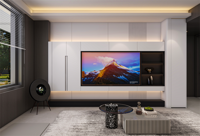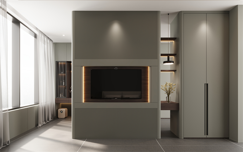 電視背景墻采用簡(jiǎn)潔流暢的線條,與簡(jiǎn)約的“晨露白”色彩完美融合,弧形轉(zhuǎn)角過渡,展現(xiàn)一種簡(jiǎn)約而不失精致的柔美感。電視柜采用高端定制精湛工藝,包括黑科技的懸浮設(shè)計(jì)+柜中柜設(shè)計(jì)+拉米諾/無孔工藝,打破傳統(tǒng)墻面的厚重感,賦予空間輕盈靈動(dòng)的觀感。