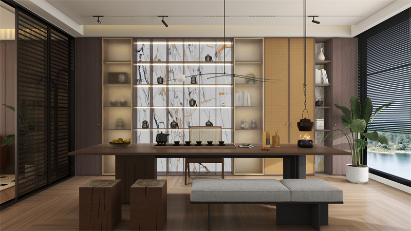 在清淺時光里,一手煙火一手詩意,任窗外花開花落,云來云往,自是余味無盡,萬般愜意。茶室以素色調為主,深色的天然紋理厚實而流暢,打造質樸的空間,帶來的不僅僅是原始的茶味,更是一種隨性的灑脫意境。