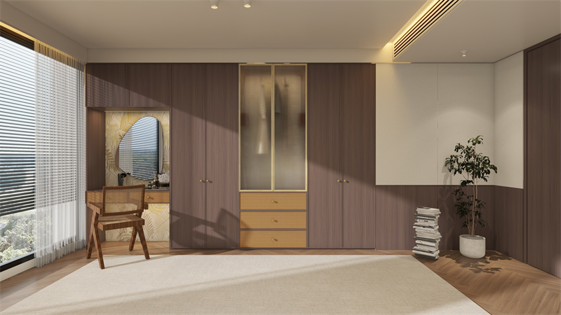 整個空間以深色木紋打底,大面積的木紋拼框柜門,既保留中古經(jīng)典特色,也兼?zhèn)涔诺渑c現(xiàn)代美感。衣柜局部應用長虹玻璃,嵌入梳妝臺,搭配內嵌燈帶,透光不投影的朦朧感,驚艷每一天。