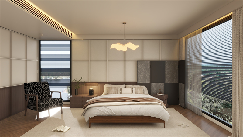 溫潤柔和的臥室空間,捕捉記憶與情感的詩意,陳述著過去與未來的情愫。床頭背景墻采用凹凸有致、細膩流暢的骨骼線與拼色護墻板,讓空間呈現(xiàn)多維立體的藝術美。落地窗讓陽光灑進來,整個空間都亮了起來,感覺走進了溫暖的夢境。