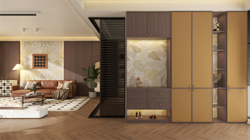 微醺濾鏡下的中古風,從入戶起就開始鋪墊復古的基調。胡桃木紋理搭配咖啡色藤編,讓古樸的氣息從玄關開始,彌漫家中每個角落,以復古高級的腔調為畫筆,勾勒出自帶電影氛圍感的空間,打造富有享受的視覺空間。