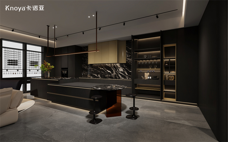 入戶、客廳、廚房空間,采用卡諾亞新品極簡(jiǎn)風(fēng)格木韻系列,黑色與金色的奢雅搭配,柔和的木紋肌理與線條營造濃郁的意式韻味。
