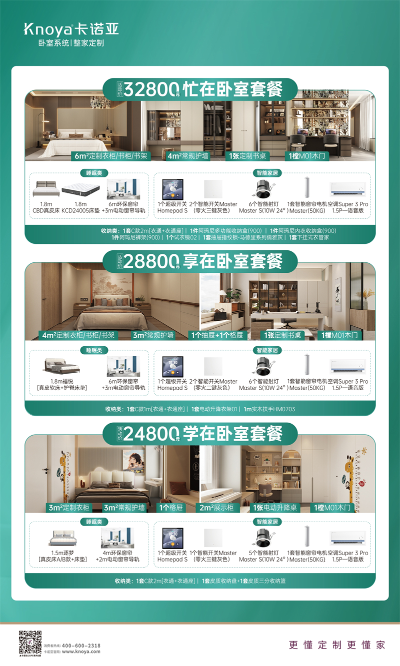 卡諾亞此次315活動,攜手多個高端品牌如芝華仕、CBD、云米科技等,為消費者提供一站式的家居解決方案。活動期間,卡諾亞除了以上2大套餐,還精心推出32800元忙在臥室套餐、28800元享在臥室套餐、24800元學在臥室套餐等,涵蓋臥室系統+整家定制兩大品類,包括定制柜、護墻板、全屋家具以及智能家電,聯手更多大牌,真正實現“整家定制更高配,全屋家具更滿配,智能家電更全配”的理念。