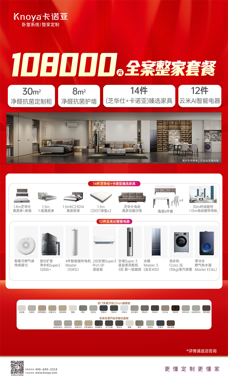 品質生活,從臥室開始。本次活動,卡諾亞攜手芝華仕、CBD、云米科技等多個知名品牌,傾情推出32800元忙在臥室套餐、28800元享在臥室套餐、24800元學在臥室套餐等,整合臥室系統定制+高端整家配套,包含定制柜、護墻板、家具家品及智能家電,一站式打造舒適睡眠、智能便捷、格調美學、高效收納兼備的品質休憩空間。