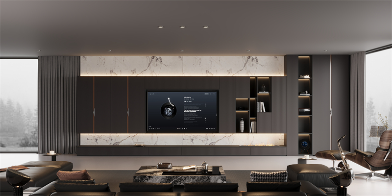·材質對話:直紋肌理板材與澀黑柜體形成深淺對比,數碼打印出來的紋理如大理石般通透,鋁木玻璃柜將金屬堅韌與木材溫潤完美結合。