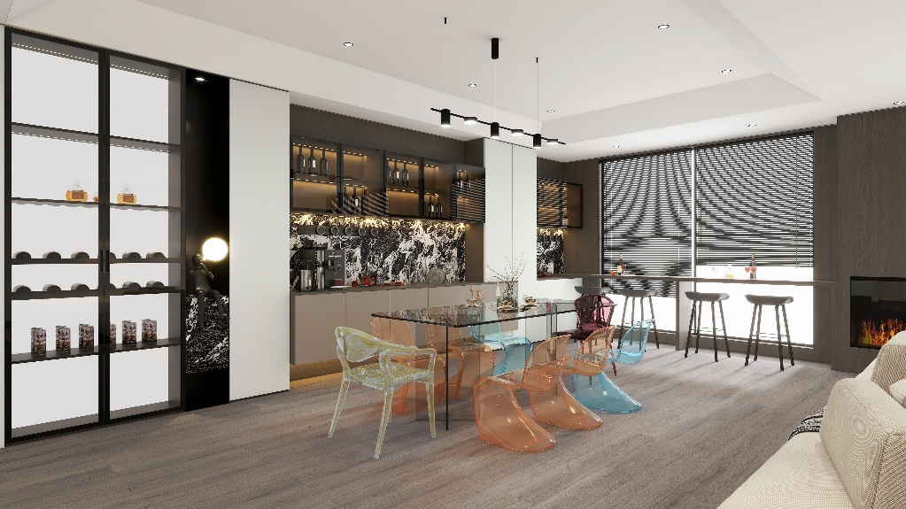 餐廳區(qū)域巧妙融入了品酒區(qū)和咖啡區(qū)。PET材質(zhì)的餐邊柜臺(tái)面觸感細(xì)膩,耐高溫且易于清潔,完美適配年輕人的生活方式。墨海云巖三胺點(diǎn)綴色與生椰灰主色調(diào)形成優(yōu)雅對(duì)比,營(yíng)造出精致的用餐氛圍。從早餐的明亮活力到晚餐的溫馨浪漫,全方位滿足年輕人的生活儀式感。