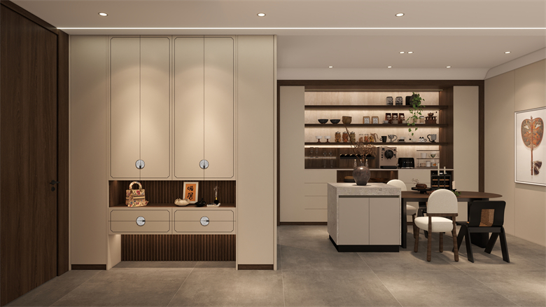 玄關,作為家的第一道風景,在方寸間盡顯山水意趣與禪意。拉手與門型的設計靈感源自禪意中式美學中的海棠花與水墨畫,仿佛一幅微縮的山水畫卷,盡顯文人意趣。綺羅布紋飾面質感細膩,在光影的流轉中透露出織物的溫潤與雅致。展示格中,一器一物皆成景致。一入門,便能感受到“小隱于市”的寧靜與淡泊。