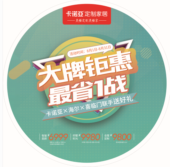 據(jù)了解,九月尚未到來,卡諾亞便搶先進入作戰(zhàn)狀態(tài),策劃了針對剛需房裝修的“大牌鉅惠,最省1戰(zhàn)——卡諾亞×海爾×喜臨門聯(lián)手送好禮”全國優(yōu)惠活動。8月1日-31日期間,卡諾亞牽頭各大戰(zhàn)略合作品牌,以定制家居帶動家裝、家飾、家電的一站式讓利活動,滿足消費者精裝修需求。
